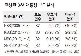 < 한겨레 > 는 언론시민단체인 민주언론시민연합(민언련)과 함께 노무현·이명박 정권 집권 3년차(2005년, 2010년) 1~3월 3개월간의 한국방송 '뉴스9'의 대통령 관련 보도를 분석했다. 분석 결과를 보면, 86건의 이명박 대통령 보도 가운데 23건(26.7%)이 우호적인 논조를 보였다. 반면 노무현 대통령 시절, 한국방송의 대통령 관련 기사 87건 가운데 우호적인 기사는 5건(5.7%)에 불과했다. 앵커나 기자가 대통령의 발언이나 행동에 상당히 긍정적인 의미를 부여하거나, 화면에서 대통령 이미지를 지나치게 강조하는 기사를 '우호적 보도'로 분류했다. 비판적인 보도도 노 대통령의 경우 9건(10.3%)이나 됐지만, 이 대통령은 2건(2.3%)에 그쳤다.
