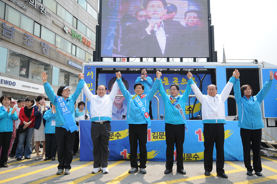 김문수 한나라당 경기도지사 후보가 29일 오전 경기도 성남시 중원구 성남시장 앞에서 유세를 마치고 황준기 성남시장 후보 등과 함께 손을 들고 시민들에게 인사를 하고 있다.ⓒ 민중의소리 양지웅 기자