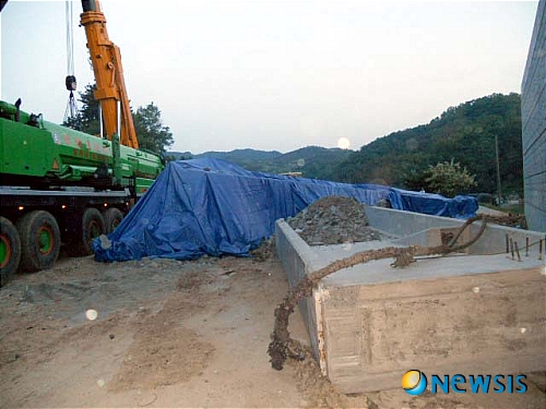 - 【경주=뉴시스】이종찬 기자 =18일 오후 경북 경주시 양북면 장항리 '경주-감포1' 국도 4차선 건설공사 구간인 양북면 음지마을 통과하는 교량건설현장에서 사고로 동강난 교량상판 빔(오른쪽)과 크레인에 연결했던 헤진 빔의 와이어가 보인다, 시공사는 동강난 다른 교량 빔을 파란 덮게로 가려놓고 있다. jclee0511@newsis.com 2011-05-19