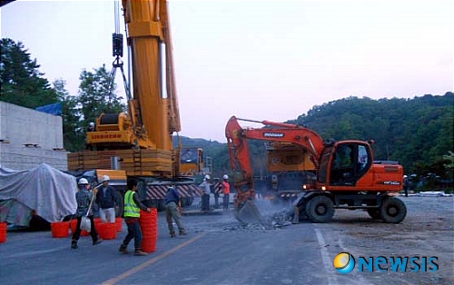 - 【경주=뉴시스】이종찬 기자 = 18일 오후 경북경주시양북면 장항리 '경주-감포1' 국도건설현장에서 발생된 교량건설사고로 교량상판빔의 추락으로 파괴된 국도를 시공사인 P사측이 장비와 인력을 동원해 복구하고 있다. 오후 1시 발생된 이 사고는 오후 8시경 겨우 수습(도로복구)해 8시간동안의 교통체증을 해소햇다. jclee0511@newsis.com 2011-05-19